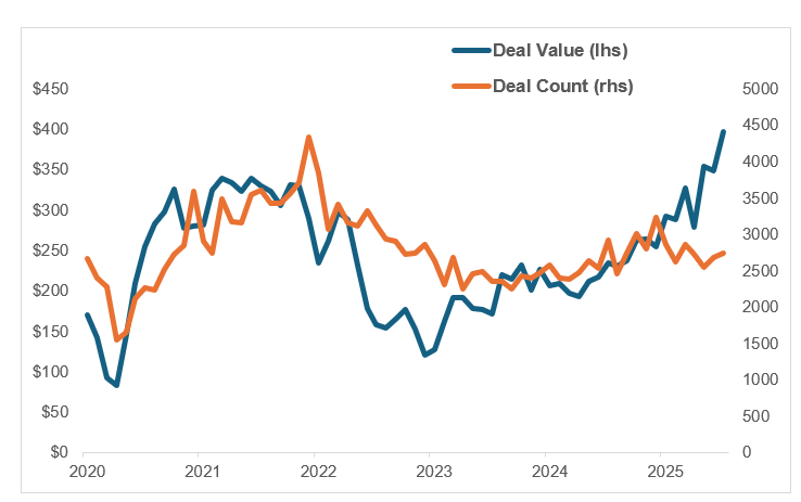 Data as of October 15, 2025. Sources: Bloomberg and WTIA. Deal count includes all proposed M&A deals.