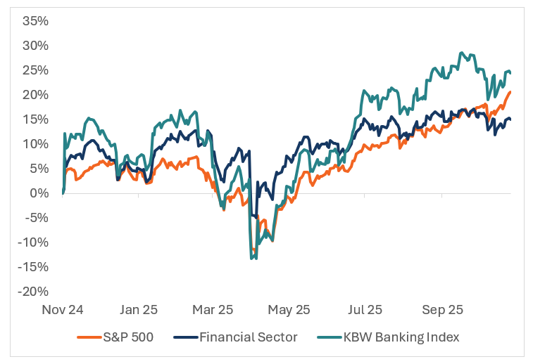 The stock market has steadily moved higher throughout the summer and into the fall—buoyed by a resurgence of tech, improved sentiment around trade policy, and expectations of a more accommodative interest rate environment. We expect that lighter and more business-friendly regulation will serve as a beneficial “ladder” for capital markets, corporate strategy, and economic growth. The recalibration of the SLR may be incremental on its own, but we believe it signals a broader deregulatory trend that could reshape operating environments for banks and free up significant capital for lending, investment, and other capital markets activities. Given continued strength of the financial sector, paired with the shifting regulatory backdrop and our expectation for a steeper yield curve, we favor financials in client portfolios – focusing on banks over insurance companies due more promising earnings potential. We anticipate that the deregulatory pipeline could act as a catalyst for other sectors, such as energy and technology, providing additional tailwinds heading into 2026.