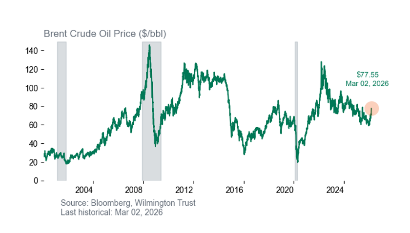 The U.S.-and-Israel initiated large-scale strikes on Iran’s military, missile, and command infrastructure on February 28, 2026. This brings to a boil what has been weeks of oscillating tensions around U.S. and Iranian negotiations. It is early days, and the initial market reaction is being seen most acutely in a spike in oil prices. Equity and fixed income volatility is so far fairly contained, but the ultimate scope of this conflict’s impact on the economy and markets will depend greatly on its duration and the degree to which oil assets are permanently impeded.