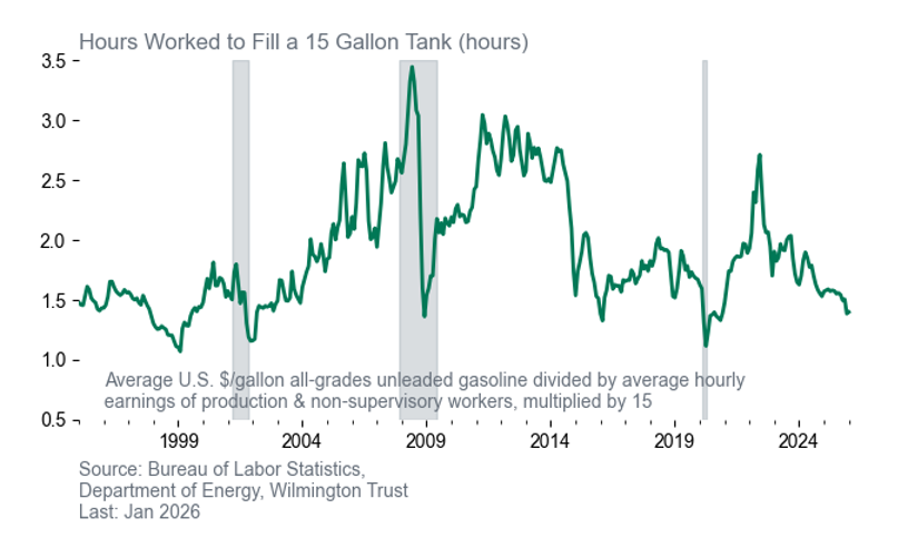 Helpfully, wages have outpaced gasoline prices for the past several years such that a blue collar, hourly worker making the average wage needed to work 1.4 hours to afford 15 gallons of gasoline at the national average pump price. As recently as June 2022, when Russia invaded Ukraine, the rate was nearly double (Figure 3). In fact, gasoline has seldom been as affordable relative to wages over the past 30 years, giving consumers a good starting point should prices spike in response to the events in Iran.