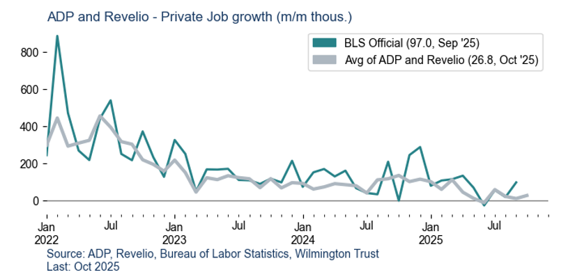 Starting with Chair Powell’s speech in Jackson Hole and on through the rate cuts in September and October, the Fed has turned their focus to the labor market. Inflation is still part of the conversation, but the Fed now sees labor market conditions as the primary driver of its next moves. This isn’t a sudden pivot; it reflects progress on inflation and growing concern that employment is softening. In recent communications, policymakers acknowledged that risks have tilted toward the labor side. With official data delayed, they – and we – are watching alternative indicators closely to gauge whether weakness is temporary or structural.