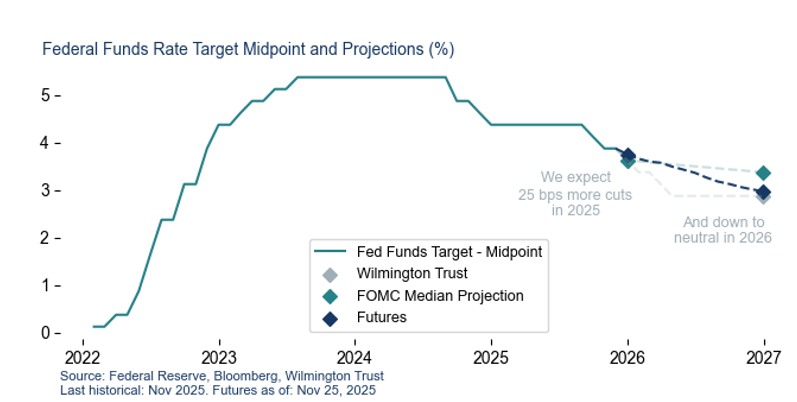 Based on these signals, we expect the Fed to cut rates at its December meeting and follow with three additional cuts in 2026. After the second rate cut of the year in October, Chair Powell warned markets against baking in another cut this year as a “forgone conclusion.” That hawkish signal was followed by a slew of Fed officials indicating a desire to hold rates, wary of inflation risks. But the September jobs data led two of the most influential voices (FOMC Vice Chair John Williams and Governor Chris Waller) to publicly support another rate cut.