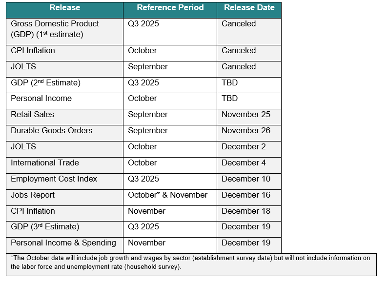 The longest government shutdown in U.S. history had far-reaching impacts, with the most tangible for the economy and markets being the delay of official government statistics. Investors use this data to gauge the path of the economy and then try to divine the direction of markets. As we head into the final month of the year, we have received a couple of key reports and await many more.