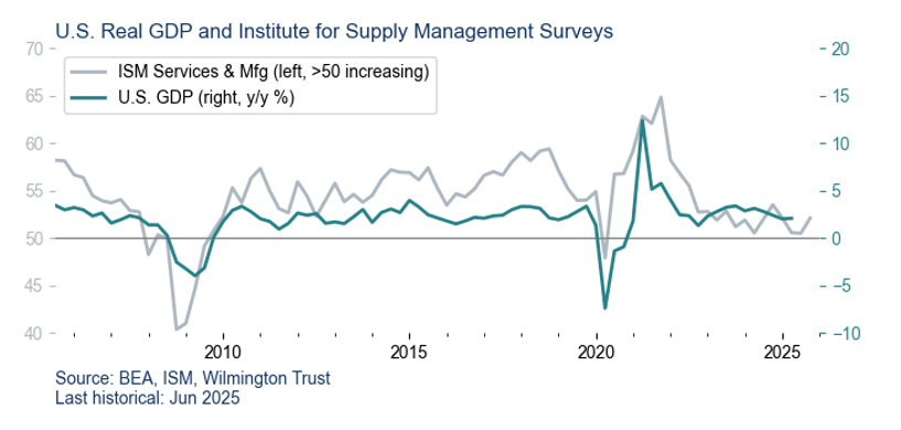 So far our outlook has not changed. Considering signals from private data sources and incorporating official releases thus far, we still see an economy that is adjusting to the tax hikes (in the form of tariffs) implemented this spring, the tax cuts from the One Big Beautiful Bill Act (OBBBA), and the pervasive uncertainty regarding future policy. We place a 45% probability on a recession within the next 12 months, with the deteriorating labor market as the key signal. But we would expect a recession, if it occurred, to be short and shallow. On the bright side, data on overall economic growth is tracking for a strong figure in Q3.
