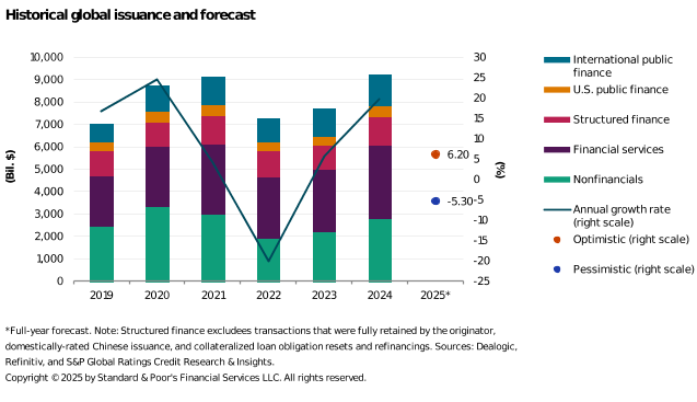 Despite these conditions, the current economic outlook still has the potential to stall activity. Any combination of concerns about tariffs, Middle East, Ukraine, U.S. Congress gridlock, or credit downgrade risks could derail the potential for seeing historic growth in this asset class. Per S&P Global, the range for issuance growth in 2025 could be as high as 6.2% or as a decrease of 5.3% due to perceived uncertainties (see chart).